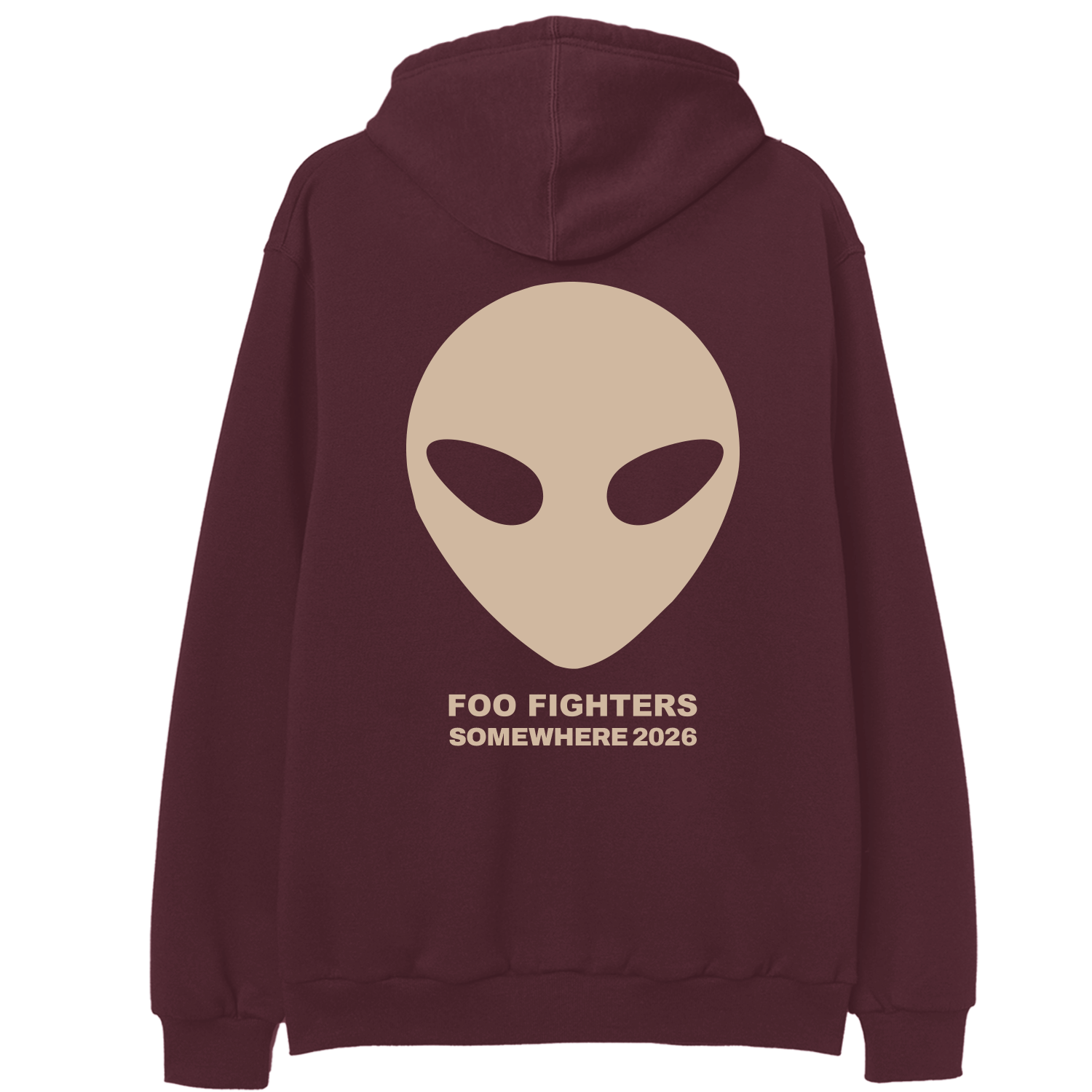 Ray gun design printed on the upper left chest and Alien Somewhere 2025 graphic printed on the back of a maroon unisex zip up sweatshirt. 50% cotton/ 50% polyester blend.